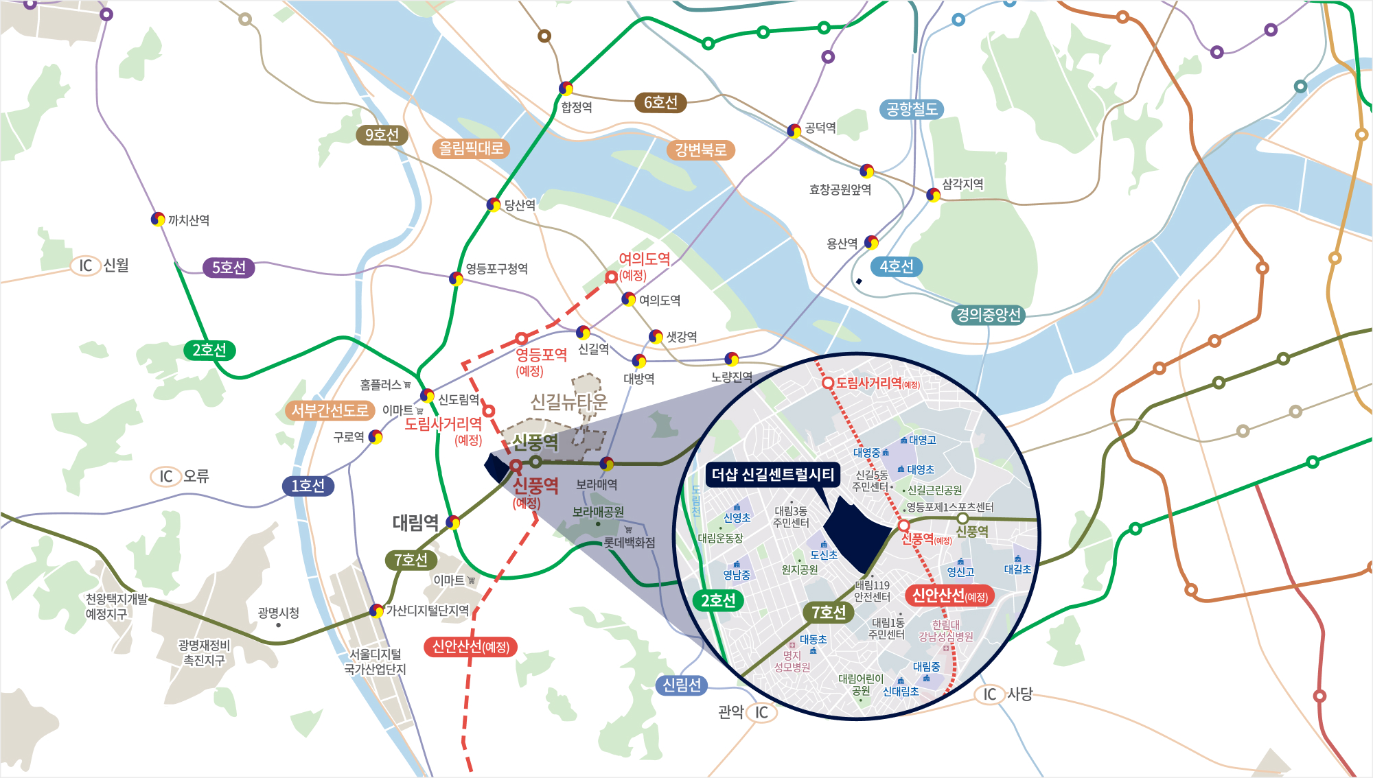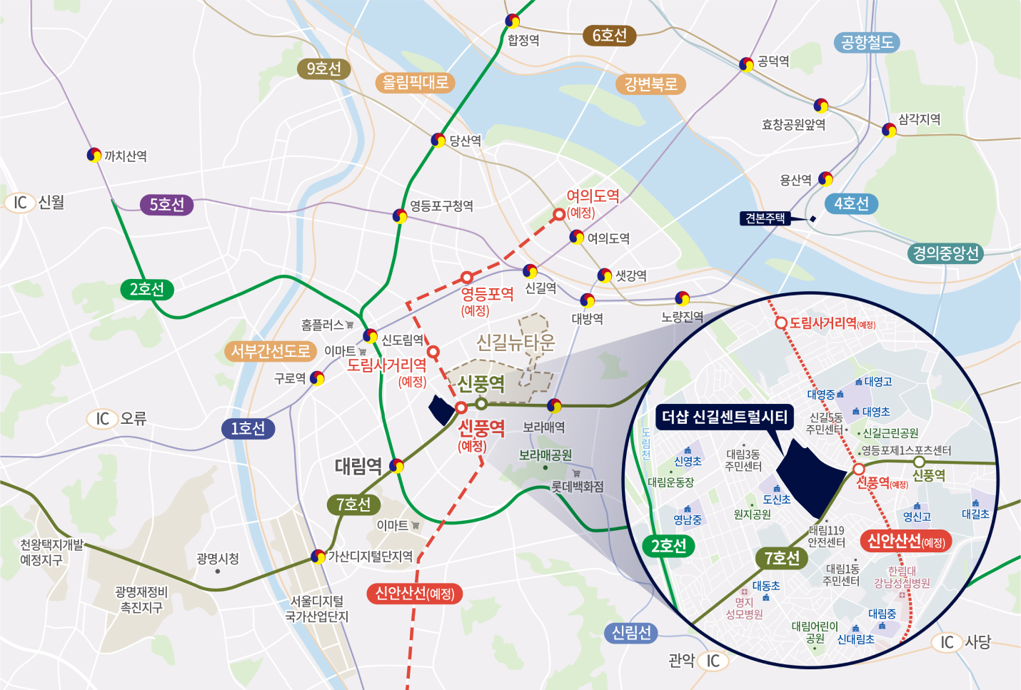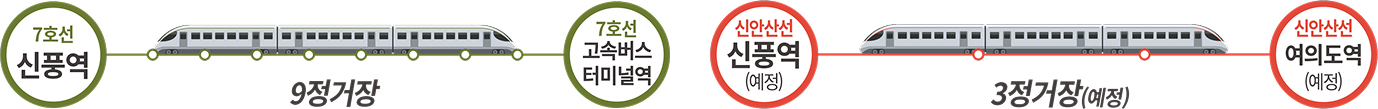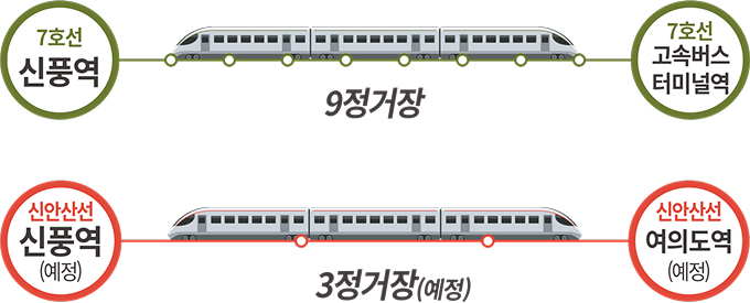 7호선 신풍역에서 강남까지 10분대, 신안산선 신풍역(예정)에서 여의도 3정거장